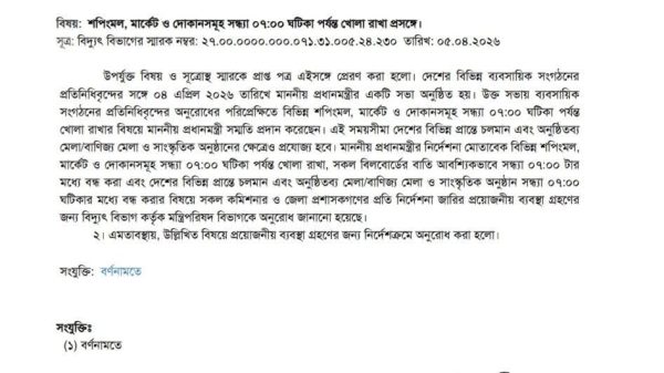বরগুনার ইরানি হত্যা মামলার রহস্য উন্মোচিত: স্বামী গ্রেফতার: ‎ তালায় ৩ পুরুষের বসতভিটায় বাড়িঘর ভাঙচুর, স্বর্ণালঙ্কার ও নগদ টাকা চুরির অভিযোগ শ্যামনগরে তেল সংকটের সুযোগে দুর্ধর্ষ ছিনতাই চক্র ‘ত্রাস’ সাঈদের অত্যাচারে অতিষ্ঠ জনজীবন পূবাইলে উল্টো পথের মাইক্রোবাস কেড়ে নিল মায়ের প্রাণ, আহত ২ শিশু ​শাল্লায় প্রশাসনের নাকের ডগায় বসতবাড়িতে সশস্ত্র হামলা ও লুটপাট: চরম নিরাপত্তাহীনতায় এলাকাবাসী ।।ছবি ভাইরাল করে দেওয়ার হুমকিতে আমতলীতে  এসএসসি পরীক্ষার্থীর আত্মহত্যা।  ঈশ্বরগঞ্জ মহাসড়কে অটো ও ইজিবাইক মুখোমুখি সংঘর্ষ নিহত -০২ ও আহত-০৩ জন। পাথরঘাটায় সাবেক মেয়রসহ ৪ কর্মকর্তার নামে ঠিকাদারের মামলা কোম্পানীগঞ্জে জাটকা সংরক্ষণ সপ্তাহ-২০২৬ উদ্বোধন জ্বালানি সাশ্রয়ের লক্ষ্যে সরকারের নির্দেশনা অনুযায়ী শপিং মল, মার্কেট ও দোকানসমূহ সন্ধ্যা ৭:০০ ঘটিকার মধ্যে বন্ধ করার জন্য নির্দেশ প্রদান করা হলো। একইসঙ্গে সকল বিলবোর্ডের বাতি আবশ্যিকভাবে সন্ধ্যা ৭:০০ ঘটিকার মধ্যে বন্ধ করতে হবে। এছাড়া, চলমান/অনুষ্ঠিতব্য মেলা/বাণিজ্য মেলা ও সাংস্কৃতিক অনুষ্ঠানসমূহও উক্ত সময়সীমার মধ্যে সমাপ্ত করার জন্য নির্দেশনা প্রদান করা হলো।