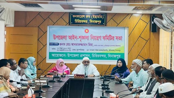 চিরিরবন্দর (দিনাজপুর) প্রতিনিধিঃ দিনাজপুরের চিরিরবন্দর উপজেলা আইন-শৃঙ্খলা নিয়ন্ত্রণ কমিটির সভা অনুষ্ঠিত হয়েছে। সভায় উপজেলার সার্বিক আইন-শৃঙ্খলা পরিস্থিতি, অপরাধ দমন, মাদকবিরোধী অভিযান এবং আসন্ন কর্মসূচি ঘিরে নিরাপত্তা জোরদারের বিষয়ে বিস্তারিত আলোচনা