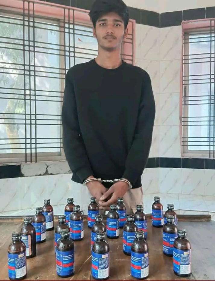 (১)একটি নেভী ব্লু রংয়ের স্কুল ব্যাগের ভিতরে পুরাতন তোয়ালা দ্বারা মোড়ানো কোডিন যুক্ত মাদকদ্রব্য ফায়ারডিল ২০ বোতল