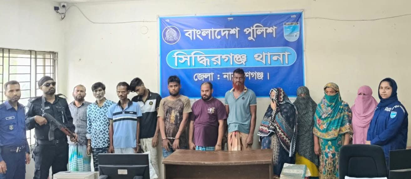 নারায়ণগঞ্জ জেলার সুযোগ্য পুলিশ সুপার জনাব মোহাম্মদ মিজানুর রহমান মুন্সী মহোদয়ের নির্দেশনায় সিদ্ধিরগঞ্জ থানার অফিসার ইনচার্জ জনাব মহম্মদ আব্দুল বারিক, পিপিএম এর নেতৃত্বে সঙ্গীয় অফিসার ও ফোর্সসহ একটি চৌকস আভিযানিক দল ০৮/০৩/২০২৬ খ্রিঃ ভোর ০৫.৩০ ঘটিকায় সিদ্ধিরগঞ্জ থানাধীন বিভিন্ন স্থানে অভিযান পরিচালনা করে ১০জন আসামীকে আটক করে। তারা হলেন: আসামী ১। মোঃ সাঞ্জু @ সঞ্জু (৩০), পিতা- মৃত চাঁন মিয়া, সাং- আইলপাড়া, থানা-সিদ্ধিরগঞ্জ, জেলা-নারায়ণগঞ্জ ২। মোঃ কাউসার (২০), পিতা- আব্দুল হক @ আব্দুল হাই, সাং- মিজমিজি (চিশতিয়া বেকারী), থানা-সিদ্ধিরগঞ্জ, জেলা-নারায়ণগঞ্জ; ৩। মোঃ আলমগীর হোসেন (৪২), পিতাঃ মৃত- মমিন আলী, মাতাঃ পারুল বেগম, সাং- বাগমারা (মসজিদের পিছনে), থানাঃ সিদ্ধিরগঞ্জ, জেলাঃ নারায়ণগঞ্জ; ৪। মোঃ জাহাঙ্গীর (৪৬), পিতাঃ আলী আহম্মদ, মাতাঃ পরি বানু, সাং- শিমরাইল (বউ বাজার), থানাঃ সিদ্ধিরগঞ্জ, জেলাঃ নারায়ণগঞ্জ; ৫। শাহিদা বেগম (৩৬), স্বামীঃ মৃত- আলমগীর হোসেন, পিতাঃ মৃত- আব্দুল আলিম, মাতাঃ আনোয়ারা বেগম, সাং- শিমরাইল (বউ বাজার), থানাঃ সিদ্ধিরগঞ্জ, জেলাঃ নারায়ণগঞ্জ; ৬। শাহনাজ বেগম (৪০), স্বামীঃ মৃত- আলমগীর হোসেন, পিতাঃ শুকুর আলী, মাতাঃ আকুল বানু, সাং- শিমরাইল (বউ বাজার), থানাঃ সিদ্ধিরগঞ্জ, জেলাঃ নারায়ণগঞ্জ; ৭। তারেক হোসেন (৪৪), পিতা- মোঃ শাহাদাৎ হোসেন পাটোয়ারী, মাতা- রোকনেয়ারা বেগম, সাং- শিমরাইল বউ বাজার, থানা- সিদ্ধিরগঞ্জ, জেলা- নারায়ণগঞ্জ; ৮। হেলেনা আক্তার (৪০), পিতা- মৃত দবির উদ্দিন, মাতা- হাসনা বেগম, সাং- শিমরাইল বউ বাজার, থানা- সিদ্ধিরগঞ্জ, জেলা- নারায়ণগঞ; ৯। আসমা বেগম (৩৮), স্বামী- নজরুল ইসলাম, পিতা- মৃত সমশের আলী, মাতা- তকরিমা বেগম, সাং- শিমরাইল উত্তরপাড়া, থানা- সিদ্ধিরগঞ্জ, জেলা- নারায়ণগঞ্জ; ১০। আলী নূর (৫২), পিতা- মৃত সমশের আলী, মাতা- তকরিমা বেগম, সাং- শিমরাইল উত্তরপাড়া, থানা- সিদ্ধিরগঞ্জ, জেলা- নারায়ণগঞ্জ। ধৃত আসামীদের হেফাজত হতে ৪৪০ পুরিয়া হেরোইন, ৪০০ গ্রাম গাঁজা, ১২ পিস ইয়াবা ট্যাবলেট ও মাদক বিক্রিত নগদ ৩২,৮০০/- (বত্রিশ হাজার আটশত) টাকা উদ্ধার পূর্বক জব্দ তালিকা মূলে জব্দ করা হয়। এ ঘটনায় মাদকদ্রব্য নিয়ন্ত্রণ আইনে তিনটি নিয়মিত মামলার রুজু করা হয়েছে। মাদক বিক্রেতা, মাদকসেবী, চোর ও চাঁদাবাজদের বিরুদ্ধে এই অভিযান অব্যাহত থাকবে।