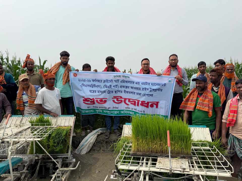 ঠাকুরগাঁওয়ের হরিপুর উপজেলার ক্লাইমেট স্মার্ট এগ্রিকালচার এবং ওয়াটার ম্যানেজমেন্ট প্রকল্পের আওতায়,রবিবার টেংরিয়ায়, রাইস ট্রান্সপ্লান্টার যন্ত্রের এর মাধ্যমে বোরো ধান প্রদর্শনী বাস্তবায়নে নিমিত্তে ট্রেতে তৈরিকৃত চারা রোপণ কার্যক্রমের শুভ উদ্বোধন করা হয়েছে। এতে প্রধান অতিথি হিসেবে উপস্থিত ছিলেন উপজেলা কৃষি কর্মকর্তা কৃষিবিদ সৈয়দ শাহিনুর ইসলাম, বিশেষ অতিথি হিসেবে উপস্থিত ছিলেন কৃষি সম্প্রসারণ কর্মকর্তা তৌহিদ-ই-খুদা, সংশ্লিষ্ট ব্লকের উপসহকারী কৃষি কর্মকর্তা তৌহিদুল ইসলাম তৌহিদ, এবং উপকারভোগী কৃষক-কৃষাণীবৃন্দ এবং স্হানীয় গন্যমান্য ব্যাক্তিবর্গ। এ বিষয়ে প্রধান অতিথি তার বক্তব্যে বলেন, ট্রেতে স্থাপিত চারা রাইস ট্রান্সপ্লান্টার এর মাধ্যমে রোপণ করলে শ্রমিক লাগে না,কম খরচে অতি দ্রুত মেশিনে লাগানো যায় বলে দিনে দিনে এর জনপ্রিয়তা বাড়ছে। এ সময় অগ্রসরমান কৃষক এবং উদ্যোক্তা মোঃ শওকত আলী প্রধান বলেন আমরা প্রতিবছরই ট্রেতে চারা তৈরি করে মেশিনের মাধ্যমে ধান লাগাচ্ছি এবং কম খরচে অধিক লাভবান হচ্ছি।