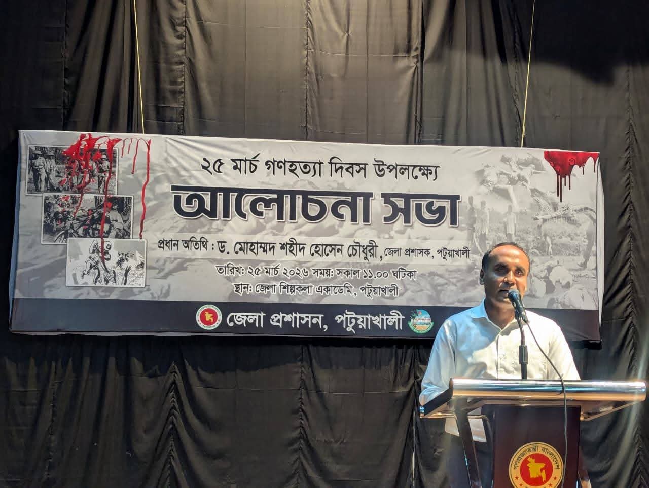 জেলা প্রশাসন, পটুয়াখালী কর্তৃক আয়োজিত ২৫ মার্চ গণহত্যা দিবস উপলক্ষ্যে অনুষ্ঠিত আলোচনা সভায় প্রধান অতিথি ছিলেন সম্মানিত জেলা প্রশাসক ড. মোহাম্মদ শহীদ হোসেন চৌধুরী। এ সময় তিনি তরুণ প্রজন্মকে ১৯৭১ সালের ২৫ মার্চ কালরাত্রে পাকিস্তানি বাহিনীর বর্বরোচিত হত্যাকাণ্ডের নির্মোহ ইতিহাস জানতে আহ্বান জানান। আলোচনা সভায় আরও উপস্থিত ছিলেন বীর মুক্তিযোদ্ধাগণ, পুলিশ সুপার, পটুয়াখালী মহোদয়, উপপরিচালক (উপসচিব), স্থানীয় সরকার মহোদয়, প্রশাসক, জেলা পরিষদ মহোদয়, জেলা পর্যায়ের কর্মকর্তাবৃন্দ, বিভিন্ন রাজনৈতিক দলের নেতৃবৃন্দ, সাংবাদিকবৃন্দ, শিক্ষার্থীগণ।