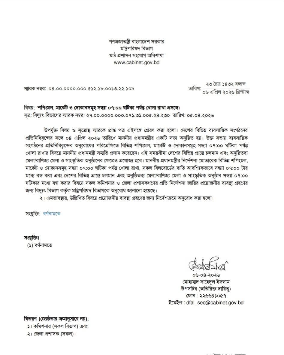 জ্বালানি সাশ্রয়ের লক্ষ্যে সরকারের নির্দেশনা অনুযায়ী শপিং মল, মার্কেট ও দোকানসমূহ সন্ধ্যা ৭:০০ ঘটিকার মধ্যে বন্ধ করার জন্য নির্দেশ প্রদান করা হলো। একইসঙ্গে সকল বিলবোর্ডের বাতি আবশ্যিকভাবে সন্ধ্যা ৭:০০ ঘটিকার মধ্যে বন্ধ করতে হবে। এছাড়া, চলমান/অনুষ্ঠিতব্য মেলা/বাণিজ্য মেলা ও সাংস্কৃতিক অনুষ্ঠানসমূহও উক্ত সময়সীমার মধ্যে সমাপ্ত করার জন্য নির্দেশনা প্রদান করা হলো।