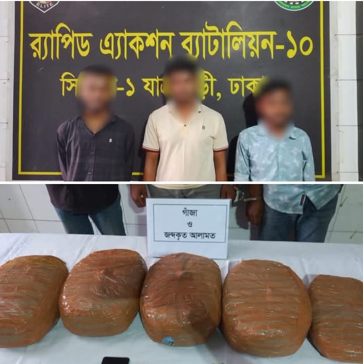 ২| গোয়েন্দা তথ্যের ভিত্তিতে র্যাব-১০, সিপিসি-১ যাত্রাবাড়ী, ঢাকার একটি চৌকস আভিযানিক দল ডিএমপি, ঢাকার যাত্রাবাড়ী থানাধীন কুতুবখালী এলাকায় একটি পরিকল্পিত অভিযান পরিচালনা করে ০৯ (নয়) কেজি গাঁজা, যার অবৈধ আনুমানিক বাজার মূল্য ২,৭০,০০০/- (দুই লক্ষ সত্তর হাজার টাকা), সহ তিনজন ব্যক্তিকে আটক করে| আটককৃত ব্যক্তিদেরর নাম ১| মো: সোবাহান (২৬), পিতা- মো: হারুন-অর-রশিদ, সাং- বারোপাড়া, ২| মো: জাহিদুল ইসলাম (২৩), পিতা- মো: জসিম উদ্দিন, সাং- সুবহানগর, ৩| মো: ফয়সাল আহমেদ (২৫), পিতা- তোফায়েল আহমেদ মিয়াজী, সাং- দূর্গাপুর, সর্ব থানা- কুমিল্লা সদর দক্ষিন, জেলা- কুমিল্লা বলে জানা যায়|